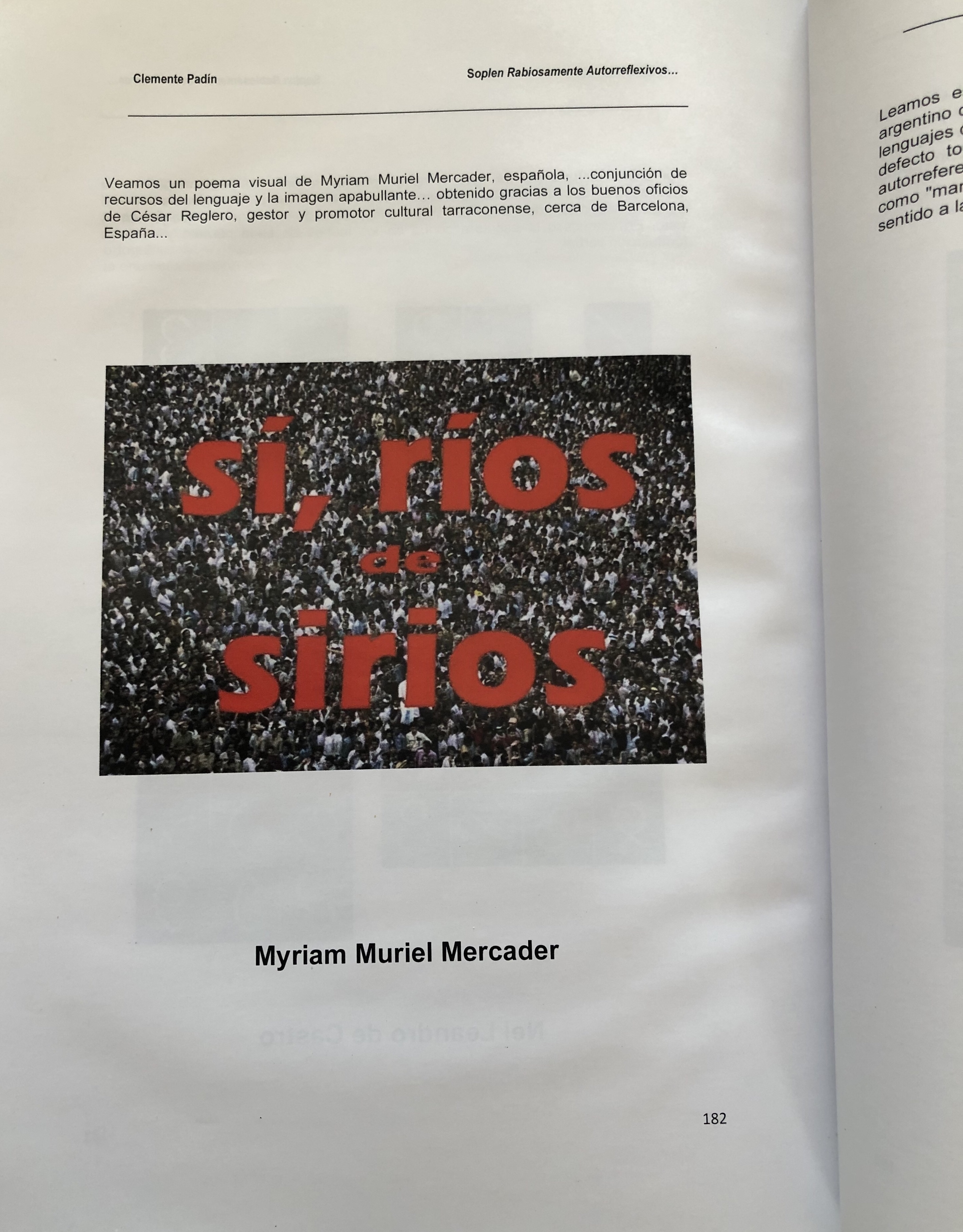 En este libro recién editado por el gran artista uruguayo Clemente Padin se compilan obras de poetas visuales desde Apollinaire, Man Ray, William Shakespeare, San Juan de la Cruz, Joan Brossa, el mismo Clemente Padin y muchos de los poetas visuales de hoy, entre los que me siento enormemente honrada de contar. Se trata de que todos los poemas presentes transgreden normas y códigos de la lengua para que la interpretación de los mismos sea más ambigua y sugerente. Pretenden hacer reflexionar al lector/expectador al tiempo que son autorreflexivos. Vale la pena internarse en él y disfrutar de todas y cada una de las propuestas.