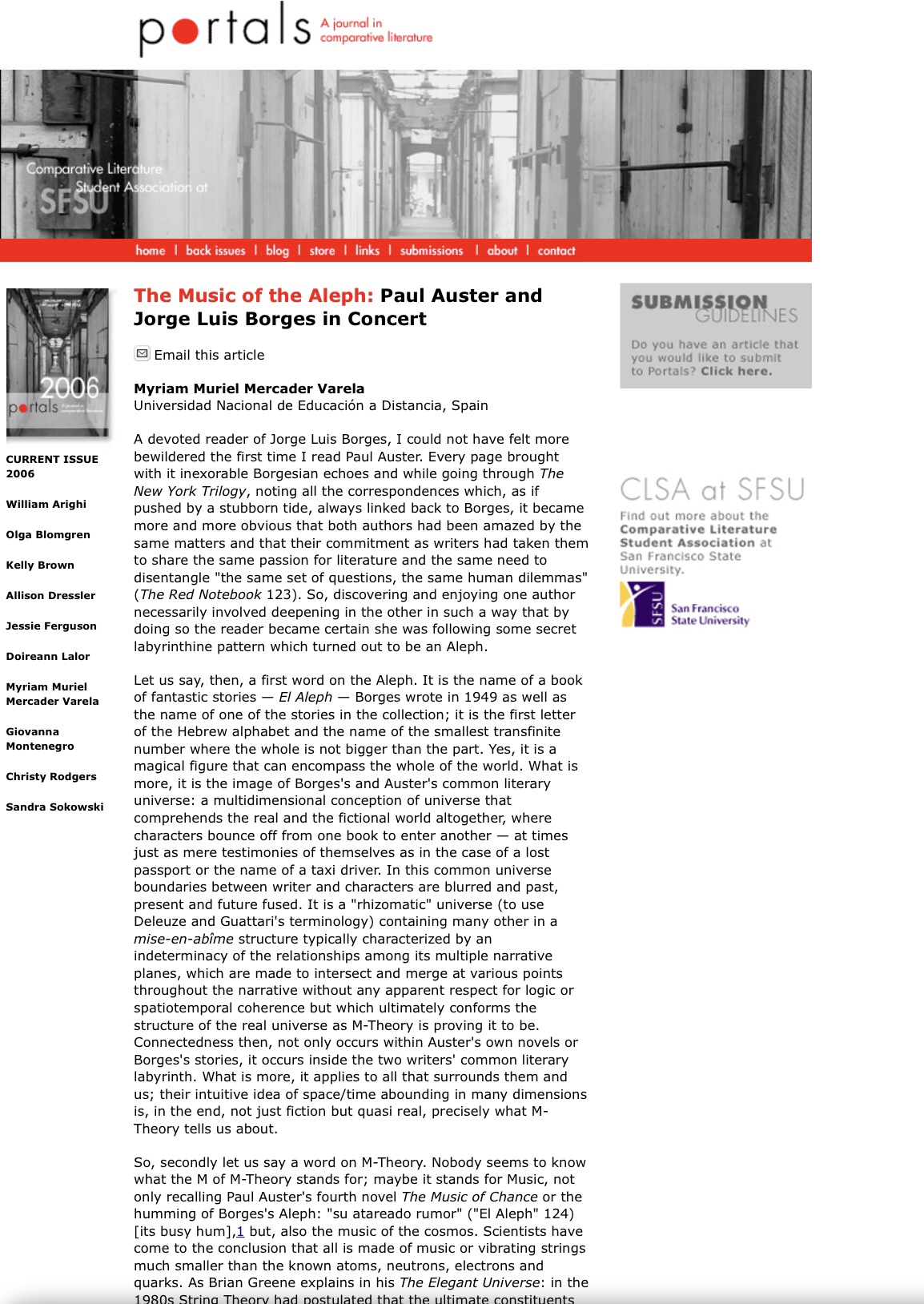 Mercader Varela, Myriam M. 2006.“The Music of the Aleph”. Portals, a Journal in Comparative Literature, Vol. 4. http://portalsjournal.com/2006/mercader.htm#. Consulted 4-3-2015.